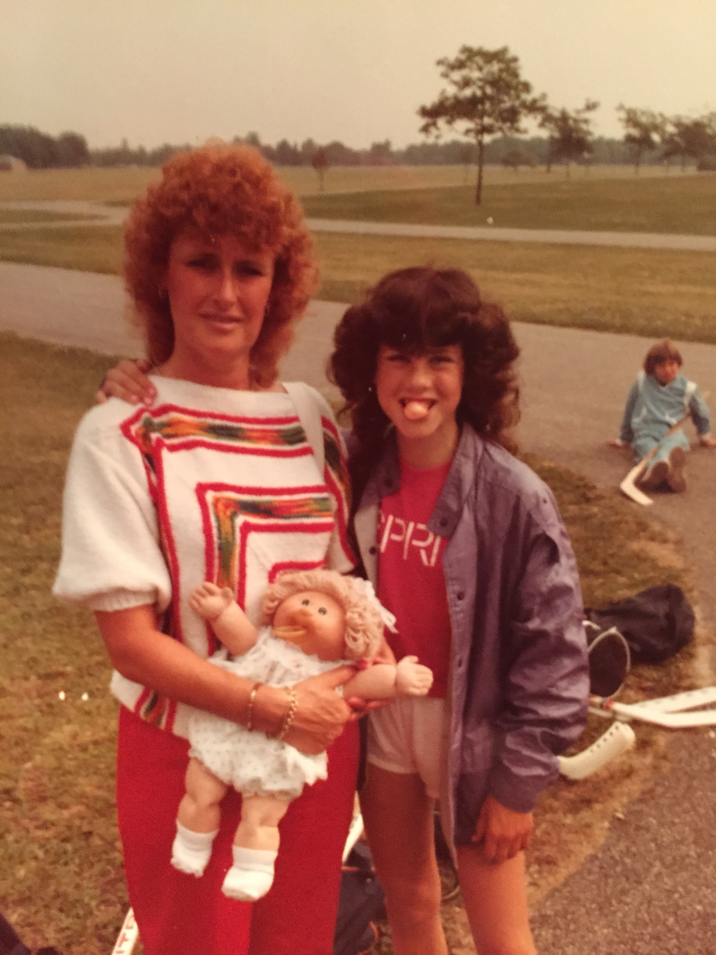(Left Image below taken at Timber Lake Camp…. hair still trying to grow and not quite sure what to do with it. Photo with mom taken at the camp bus stop a few years later during the 70’s Farrah Fawcett phenomenon with the flipped back sides – super cool with Cabbage Patch Kid to match)